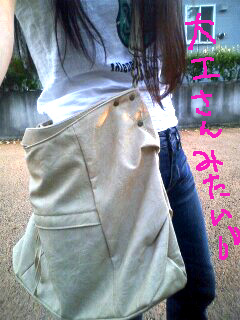 お金出してもらって選んだのは自分なんですが、買ったのを見せると母に「大工さん(が作業時に使用する釘とか入ってるやつ)みたい」と言われちゃいました(笑)いいの!実用性重視だから!いっぱいモノがはいるし、手提げにもショルダーにもなるんだから!…しかし、こうしてみるとデカ過ぎ…ですね。なんとなく、同人誌がいっぱい入るバッグをイメージしてたせいですかね(笑)しかし、胸が真っ平らじゃねーですかいィ!!(((゚Д゚)))ガタガタ