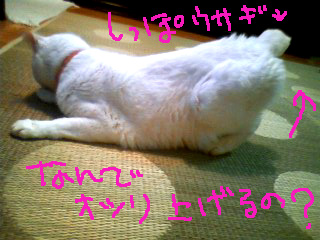 今日のメメ。ところで、何故こうやって尻を上に上げるのでしょうか?セクシャルな意味で気持ちいいのか…。慶次にも是非、四つんばいで尻を上にあげてもらいたいものです。圧し掛かってくる男がわんさか集まりそうな(赤い人とか青い人とか…)笑