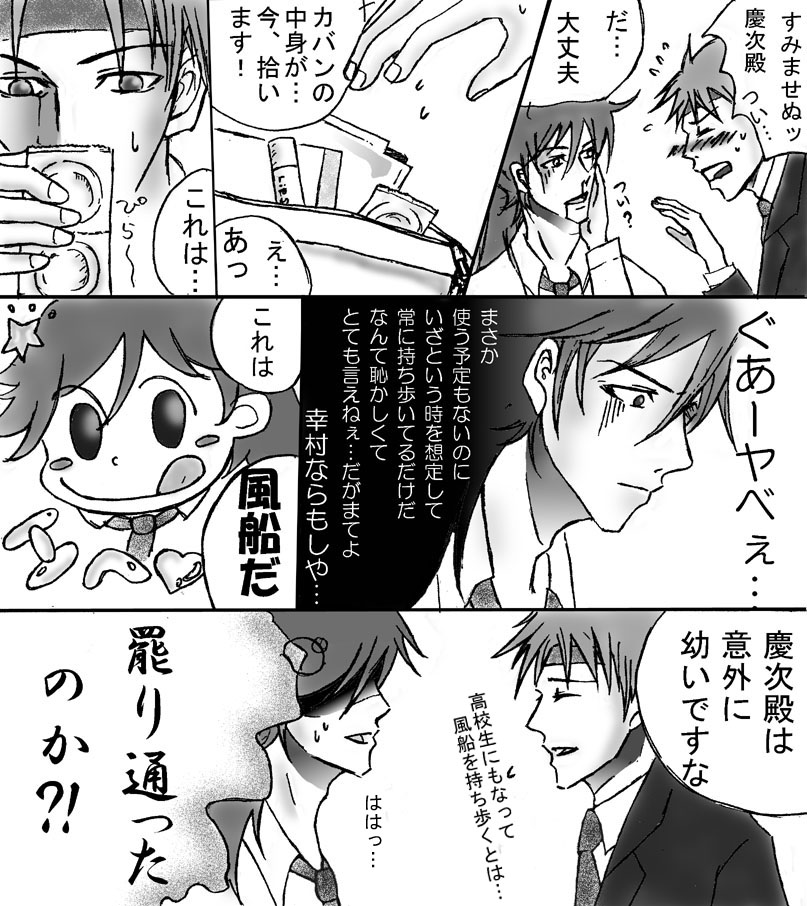 いつも拍手ありがとうございます!(*^◇^)/調子のってゴムネタの続きを描いてマス。(風船でまかり通ると、幸のヤツが本当に空気入れて膨らましほうで怖い)幸:「この風船…なにやらヌルヌルしますな…」慶:「へ?そう?最近の風船はみんなそうだよ((;゚Д゚)ガクブル」って感じで(笑)。