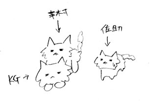三匹とも長毛でKGと幸がグレーのシマ。佐助が茶のシマ。KGと幸の違いはKGがしっぽが短く幸が長い。ちなみにイメージからこれも勝手に命名。(←オイ)KGは受けてるくらいなのでメスなんでしょうね。